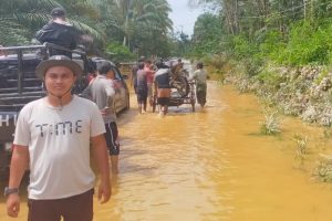 Imwar dan Saherman Warga Desa setempat salah satu penyedia jasa ojek becak gerobak, mengatakan bahwa aktivitas di jalan ini lumpuh karena jalan utama terendam banjir 1 meter.