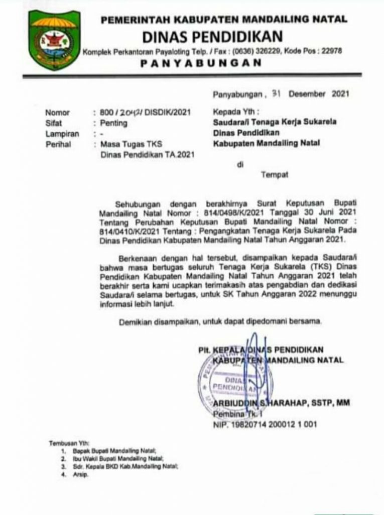 Dalam surat tersebut berintikan penyampaian kepada tenaga honor sukarela atau TKS Dinas Pendidikan Kabupaten Mandailing Natal tahun anggaran 2021 telah berakhir.