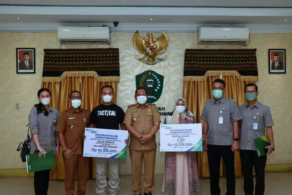 Walikota Padangsidempuan, Irsan Efendi Nasution, SH bersama Kepala Badan Penyelenggara Jamsostek menyerahkan santunan klaim jaminan kematian kepada dua ahli waris masing-masing almarhumah Helmi Aprianti yang merupakan pegawai pada Satpol-PP Padangsidempuan dan almarhum Martua Sinaga warga Tano Bato yang berprofesi sebagai pekerja proyek diruang Kerja Walikota, Selasa (25/1/2022).