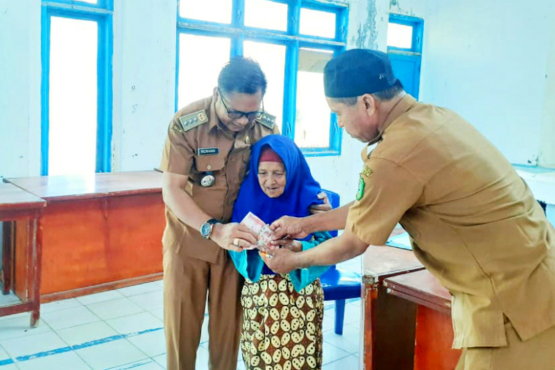 Ramadhan Penuh Berkah, Camat Bukit Malintang Roihan menyerahkan bantuan uang tunai sebesar 300 ribu rupiah kepada fakir miskin dan jompo sebanyak 55 penerima, di Aula Kantor Camat Kecamatan Bukit Malintang, Kabupaten Mandailing Natal, Sumut, Selasa, (19/04/2022).