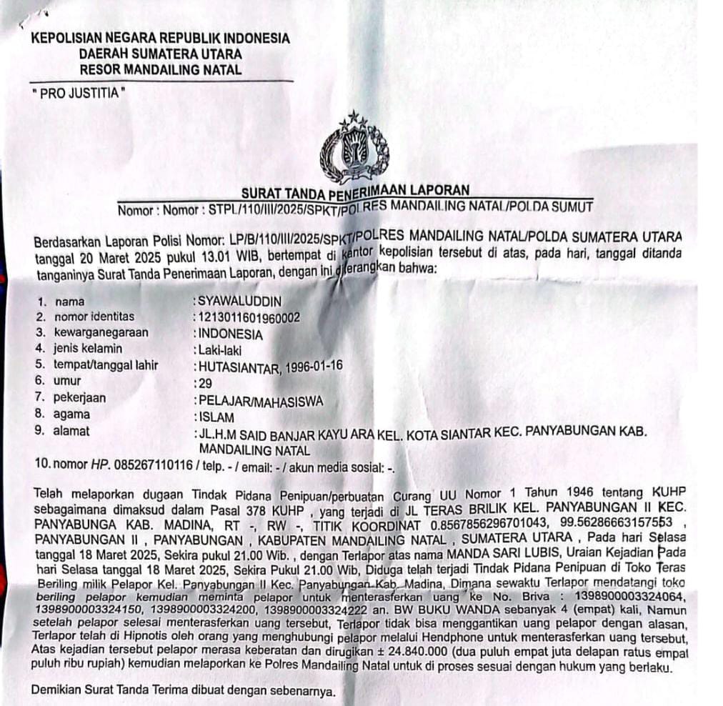 Sebelumnya diberitakan, jasa pengiriman uang Teras Brilink milik Syawaluddin di Jalan Bhakti Abri ditipu oleh perempuan bernama Manda Sari Lubis hingga menimbulkan kerugian Rp 24,8 juta. Peristiwa ini terjadi pada Selasa 18 Maret 2025 pukul 21.00 WIB.