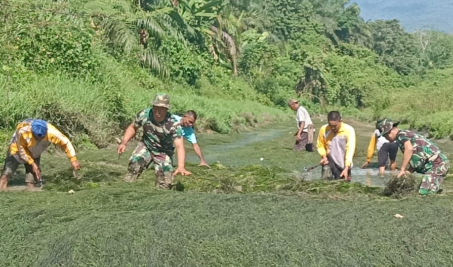 Madinapos.com, Panyabungan – Pemerintah Kabupaten (Pemkab) Mandailing Natal (Madina) melalui Dinas Pekerjaan Umum dan Penata Ruang (PUPR) bidang pengairan dan Personel Koramil 13 Kodim 0212 Tapsel gelar gotong royong bersama bersihkan saluran irigasi persawahan desa yang berlokasi dibelakang Asmil Kipan B Yonif 123/RW Desa Parbangunan Kecamatan Panyabungan.
