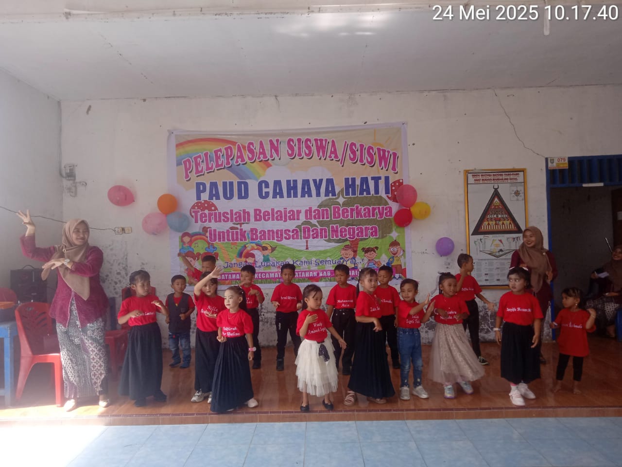 Menurut Pembina PAUD Cahaya Hati Desa Batahan III Buk Nada Rendi Septian bahwa pelepasan Siswa-siswi Tahun 2024/2025 sebanyak 7 ( Tujuh ) Orang dengan tema “Teruslah Belajar dan Berkarya Untuk Bangsa” meskipun ada yang di lepas tentu Kita berharap Siswa dan Siswi yang tamat terus belajar supaya dapat berkarya untuk Kita semua kata Buk Pembina, dilanjutkan mewakili Siswa dan Siswi yang masih belajar di PAUD Cahaya Hati Desa Batahan III berharap Jangan lupa PAUD Cahaya Hati ” Jangan Lupakan Kami Semua Ya” kata Buk Pembina.