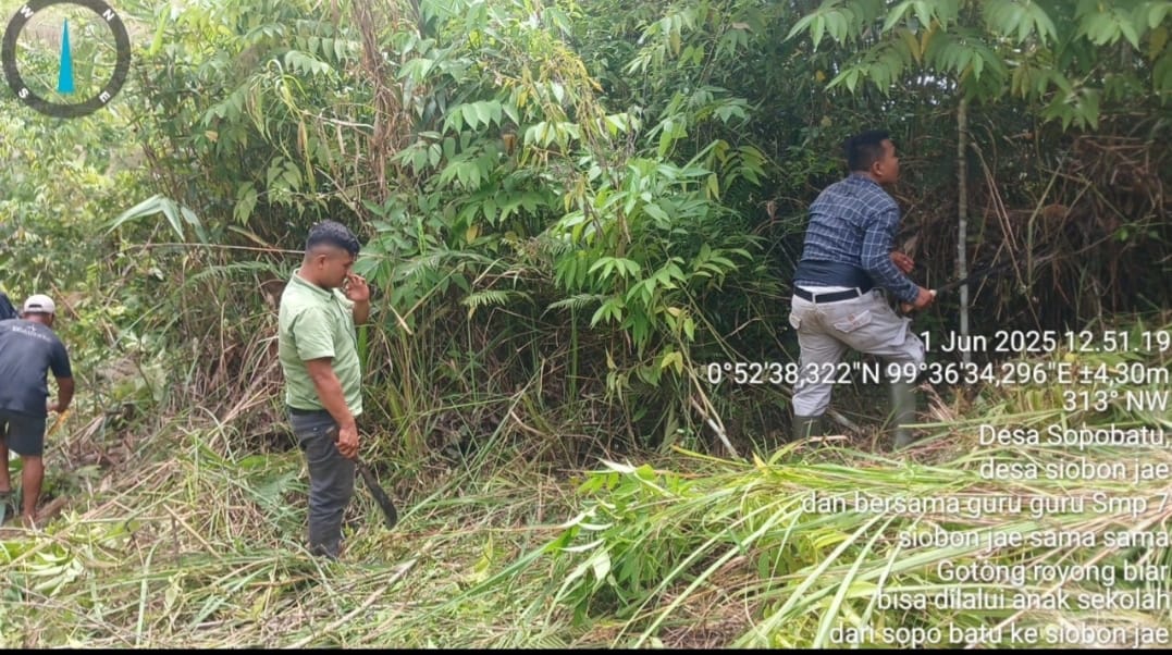 Madinapos.com, Panyabungan – Kepala Sekolah SMPN 7 Satu Atap di Desa Siobon Jae, Kecamatan Panyabungan, Kabupaten Mandailing Natal (Madina), Parwis Nasution, S.Pd, gotong royong bersama masyarakat Siobon Jae dan Sopo Batu membuka jalan lintas yang tertutup semak belukar, Minggu (1/6/2025).