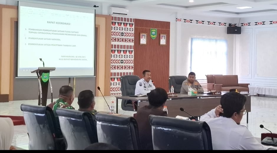 Madinapos.com, Panyabungan – Pemerintah Kabupaten Mandailing Natal (Madina) bersama jajaran Forkopimda gelar rapat koordinasi pembahasan pembentukan Satuan Tugas (Satgas) Terpadu Operasional Premanisme dan Ormas, Narkoba serta Tambang Liar, Rabu (18/6).