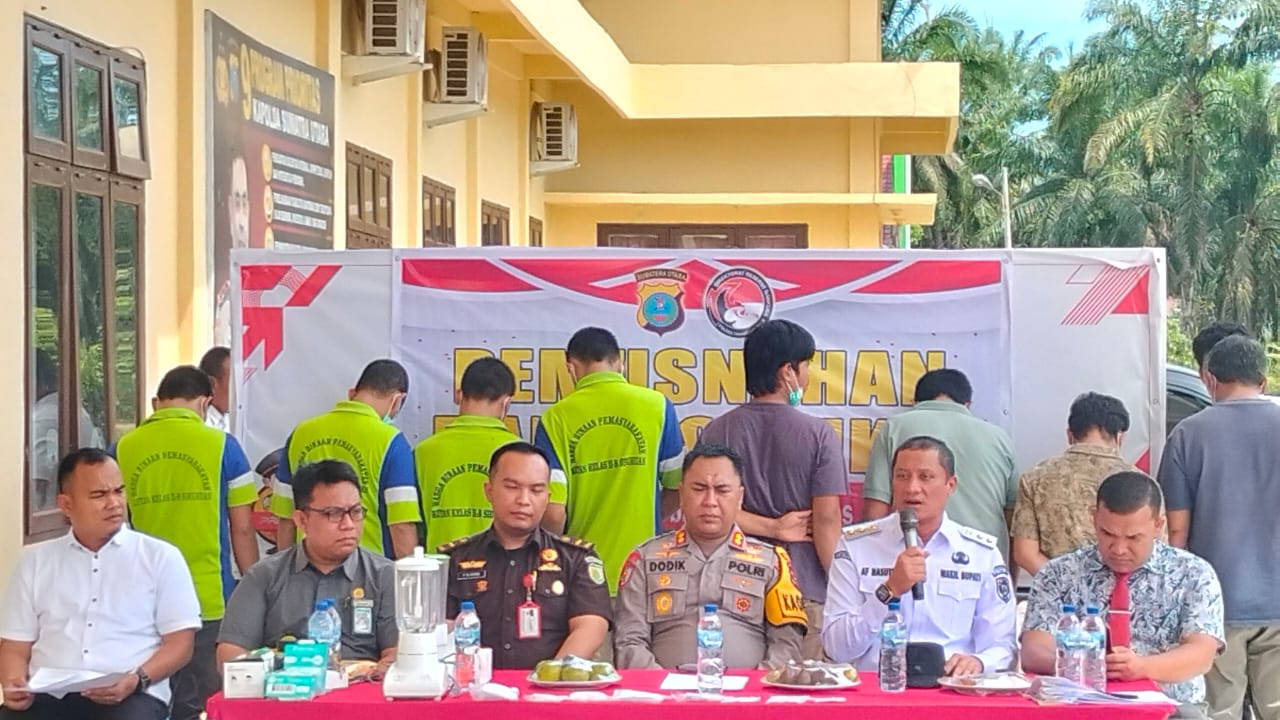 “Dan Proses pemusnahan dilakukan dengan pengawasan ketat dan diawali oleh pemeriksaan dari petugas dan lainnya. Barang bukti kemudian dimasukkan ke dalam blender, dicampur dengan air, dihaluskan, lalu dicampur deterjen dan dibuang ke septic tank dilanjutkan Penandatanganan Berita Acara Pemusnahan Barang Bukti Narkotika”. tegas Iptu Parlin Azhar Harahap, SH, MH.