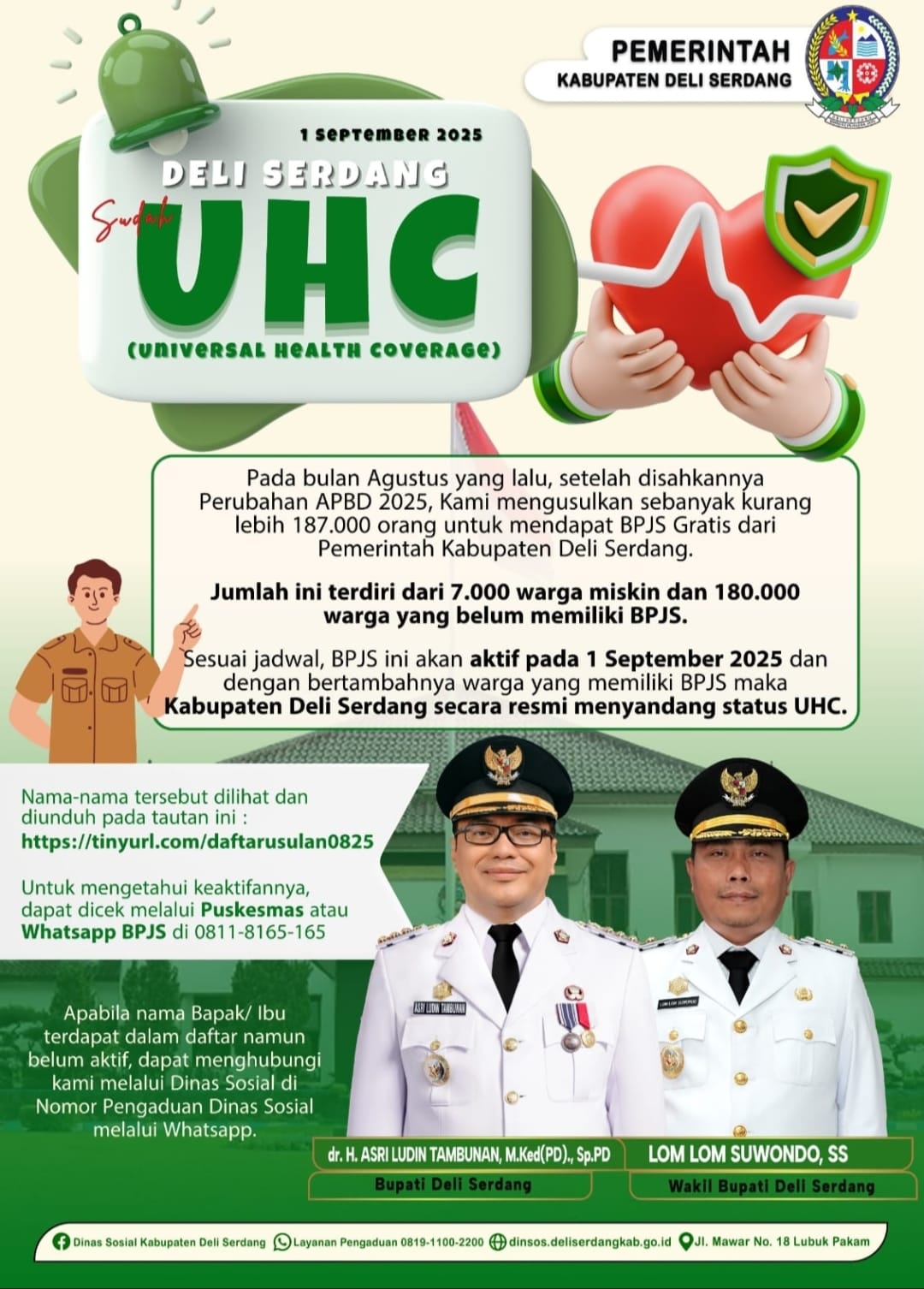 Pemerintah Kabupaten Deli Serdang juga menyediakan kanal informasi bagi warga untuk memastikan keaktifan BPJS yang baru disahkan. Daftar penerima dapat dilihat melalui tautan resmi (https://tinyurl.com/daftarusulan0825), sementara pengecekan status aktif bisa dilakukan melalui Puskesmas terdekat atau layanan WhatsApp BPJS di nomor 0811-8165-165.