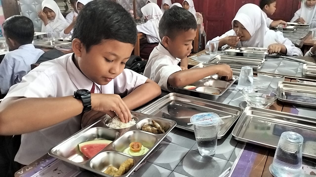 Dalam uji coba itu, siswa menikmati hidangan program MBG yang terdiri dari nasi, lauk ayam, dan tahu serta buah potong setiap istirahat pertama sekitar pukul 10.00 WIB. Para guru – guru secara mandiri membagikan makanan dalam wadah kotak tertentu kepada murid- muridnya.