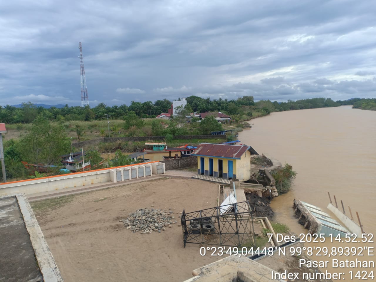 Sebagaimana di sampaikan Asbul Kepala Desa Pasar Batahan Kepada Wartawan Madina Pos Hari Minggu Tanggal 07/12/2025 di Batahan, menurut Asbul dek sepanjang 10 meter mulai ambruk sejak Tanggal 26/12/2025 sampai Kemaren kata Asbul, akibatnya satu unit MCK ikut Ambruk ke dalam sungai Batahan jelas Asbul.