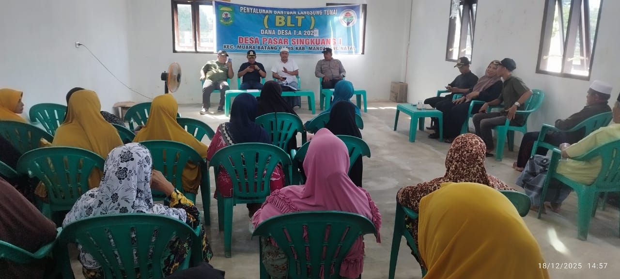 Madinapos. com, Muara Batang Gadis- Pemerintah Desa Pasar Singkuang l,melaksanakan penyaluran Bantuan Langsung Tunai Dana Desa (BLT DD) tahap 3 dan 4 untuk periode Juli hingga Desember 2025 pada hari Kamis (18/12/2025) di Kantor Desa Pasar Singkuang l,Sekira 14:00 WIB. Kec.Muara Batang Gadis, Kab. Mandailing Natal.Sumut.