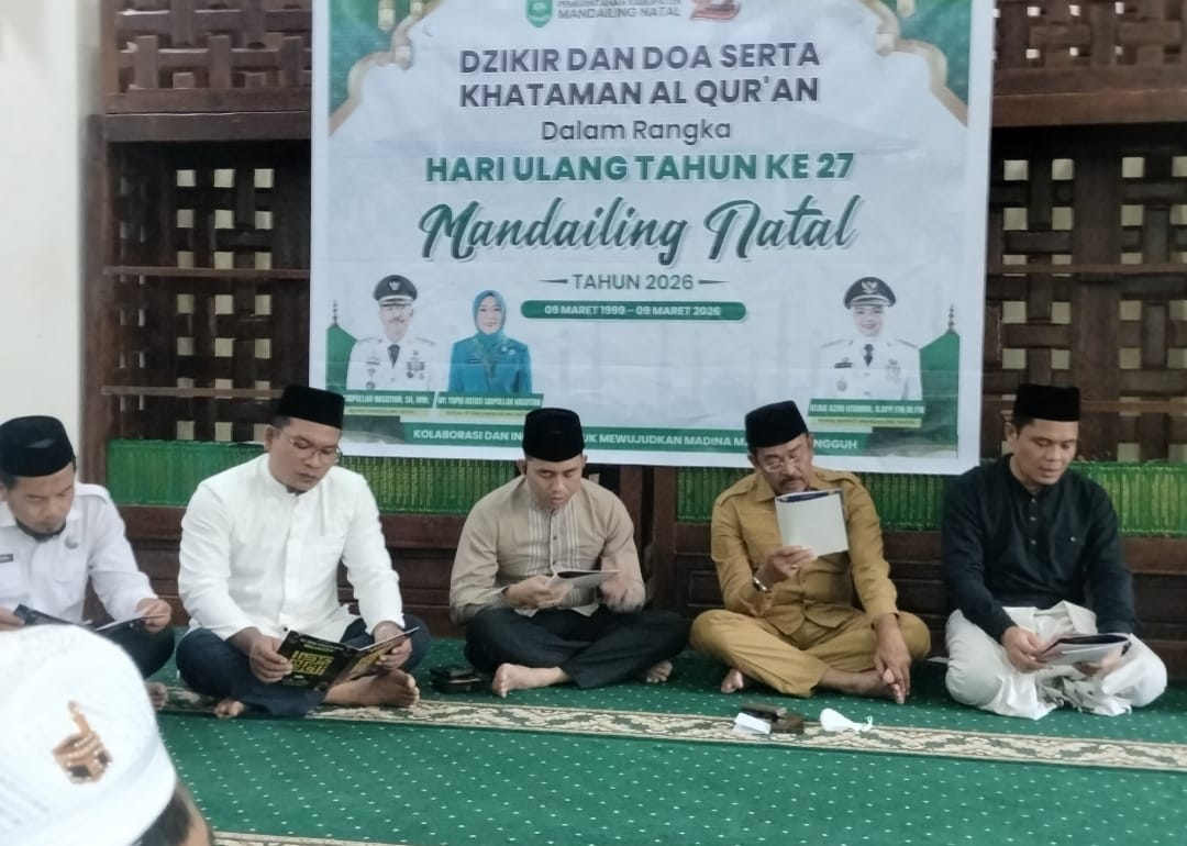 Madinapos.com, Panyabungan – Memperingati Hari Ulang Tahun (HUT) ke-27 Kabupaten Mandailing Natal (Madina), Pemerintah Kabupaten menggelar rangkaian kegiatan religius berupa Dzikir, Doa Bersama, serta Khataman Al-Qur’an.