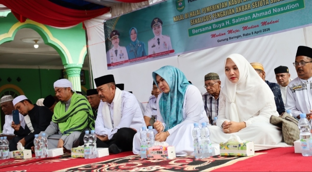 Madinapos.com, Panyabungan Timur – Ribuan warga memadati halaman Masjid Jami’ Diyaul Islam, Kelurahan Gunung Baringin, Kecamatan Panyabungan Timur, dalam rangka acara Halalbihalal, Tabligh Akbar, dan Sejuta Salawat 1447 Hijriah, Rabu (08/04/2026).