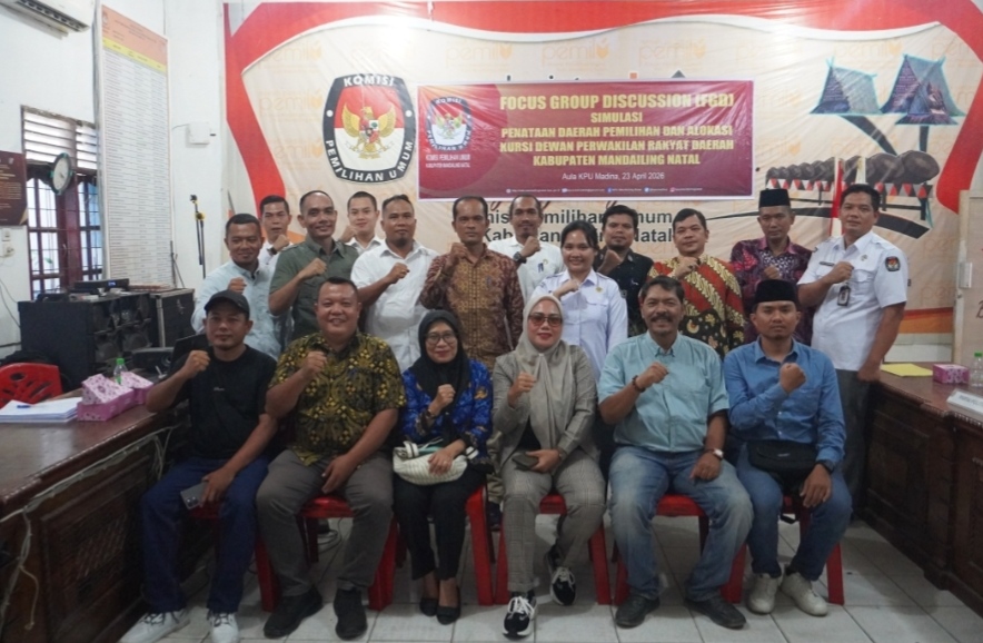 Madinapos.com, Panyabungan – Komisi Pemilihan Umum (KPU) Kabupaten Mandailing Natal (Madina) menggelar kegiatan Focus Group Discussion (FGD) terkait Simulasi Penataan Daerah Pemilihan (Dapil) di Aula KPU Madina pada Kamis (23/4/2026).