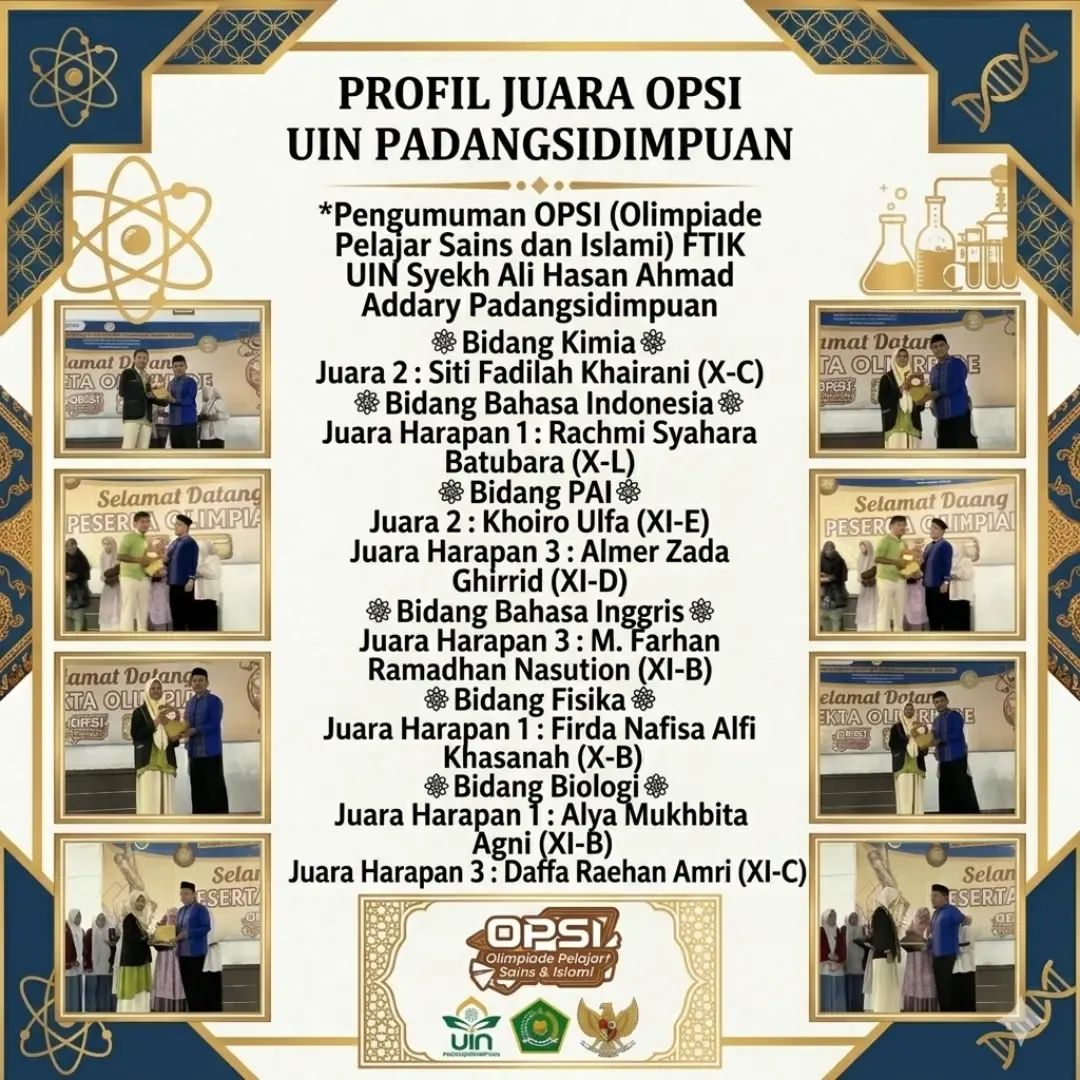 Madinapos.com, Padang Sidimpuan – Madrasah Aliyah Negeri (MAN) 1 Mandailing Natal kembali mengukuhkan posisinya sebagai sekolah berprestasi. Kali ini, delegasi siswa mereka sukses membawa pulang sederet penghargaan dari ajang Olimpiade Pelajar Sains dan Islami (OPSI) yang dihelat oleh FTIK UIN Syekh Ali Hasan Ahmad Addary, Padangsidimpuan.