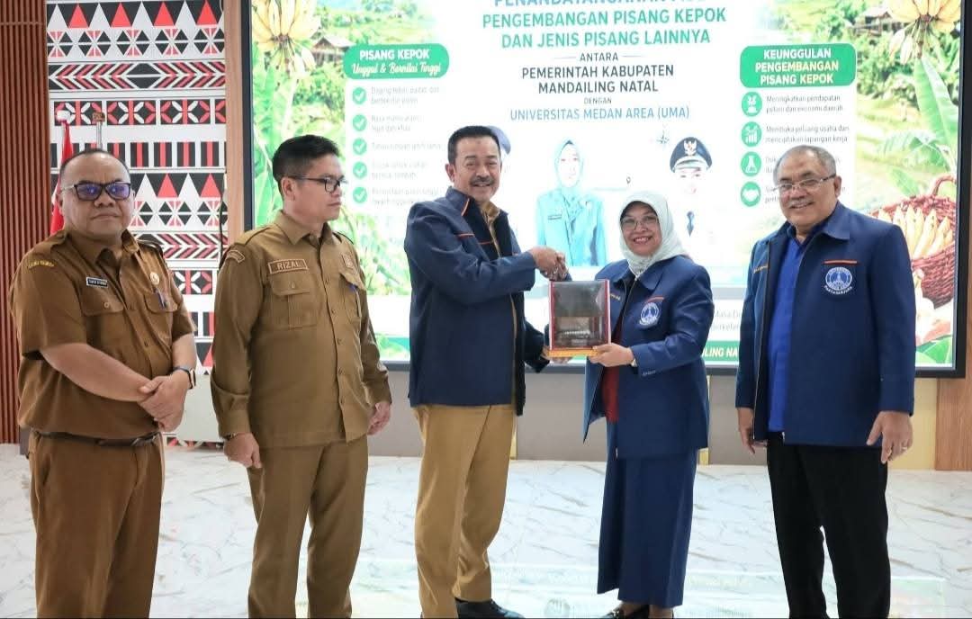 Madinapos.com, Panyabungan – Pemerintah Kabupaten Mandailing Natal (Pemkab Madina) bersama Universitas Medan Area menandatangani Memorandum of Understanding (MoU) dan Memorandum of Action (MoA) budidaya pisang kepok di Aula Kantor Bupati, Komplek Perkantoran Payaloting, Panyabungan, pada Selasa, 28 April 2026.